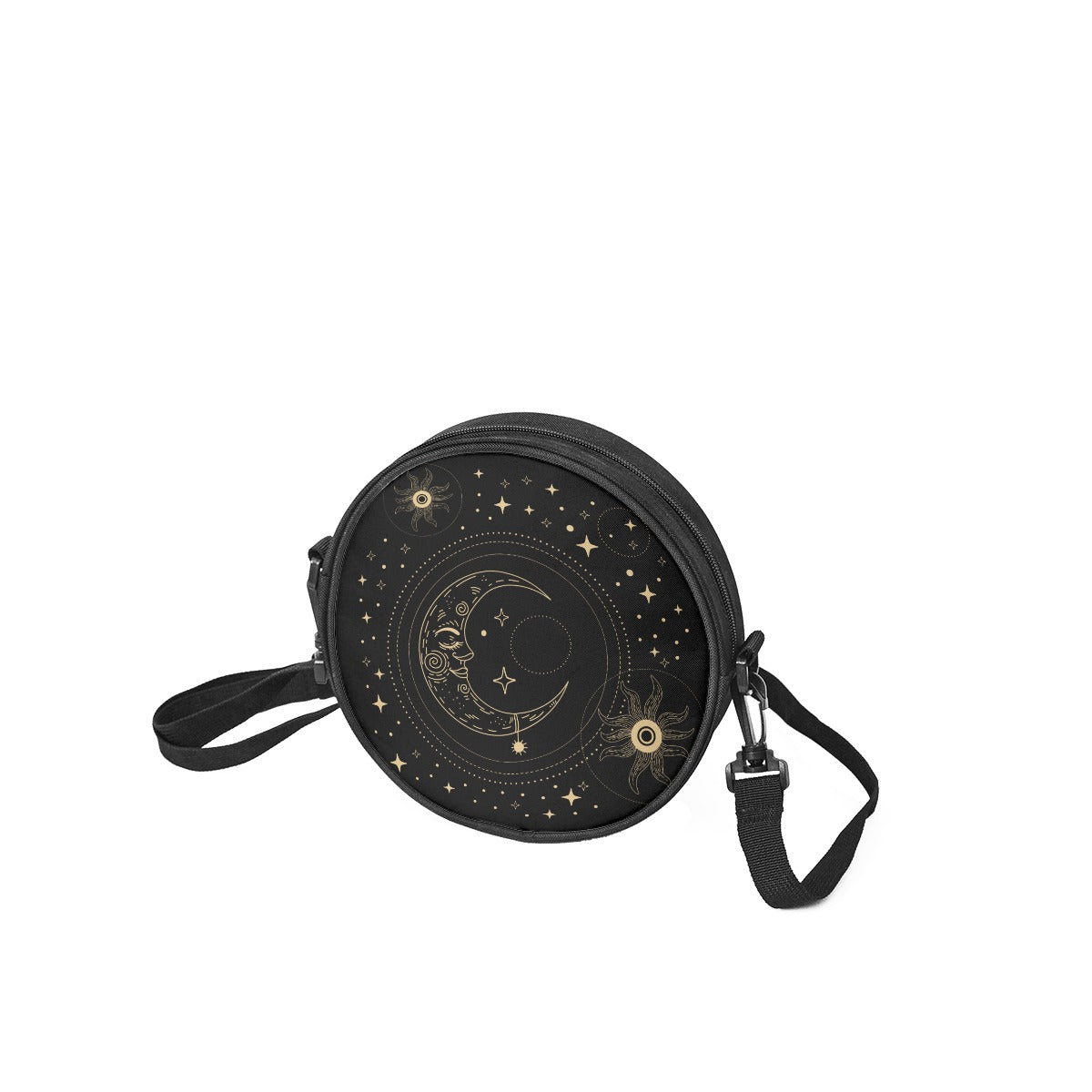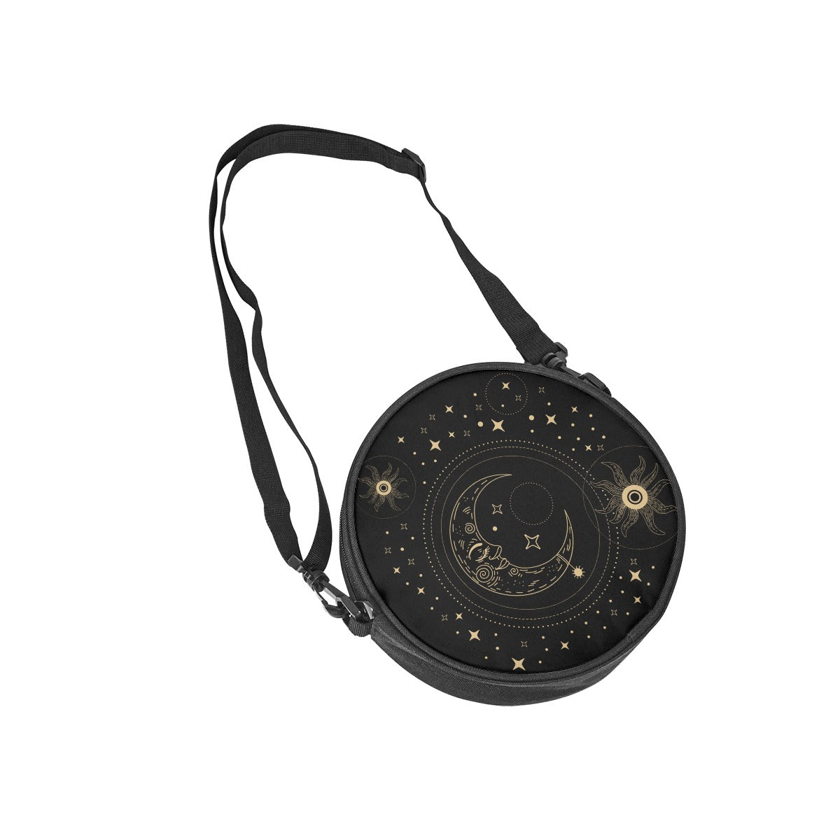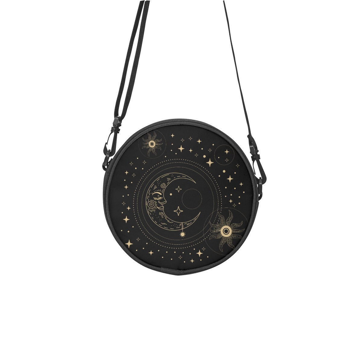 Bolsa redonda preta com motivo de lua e sol em estilo boho gótico
