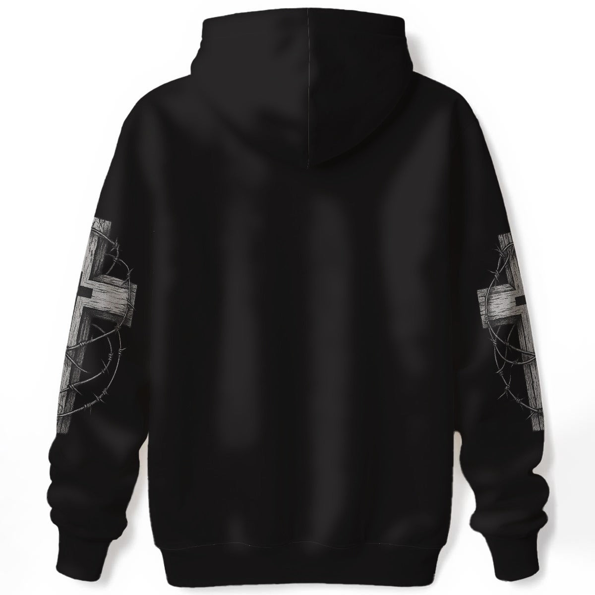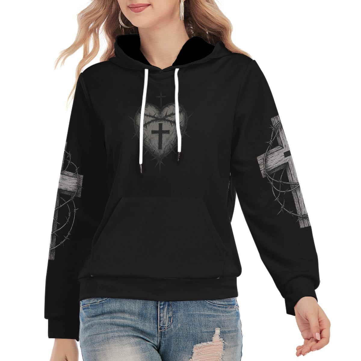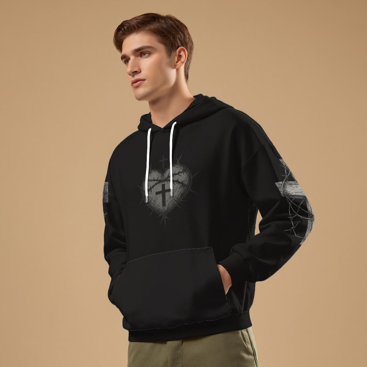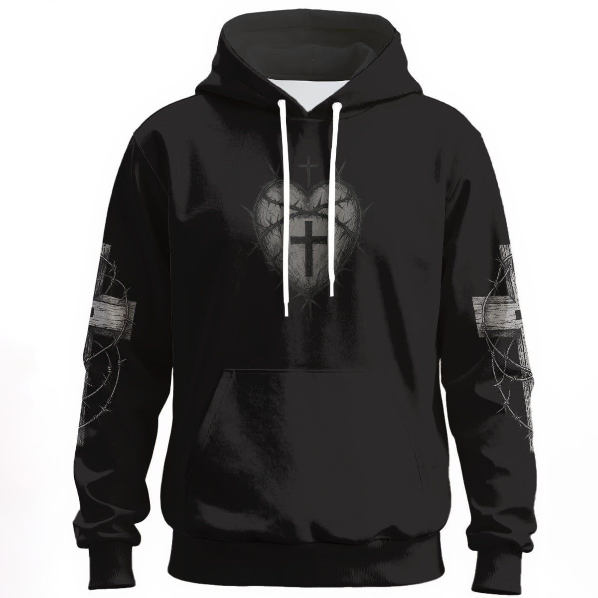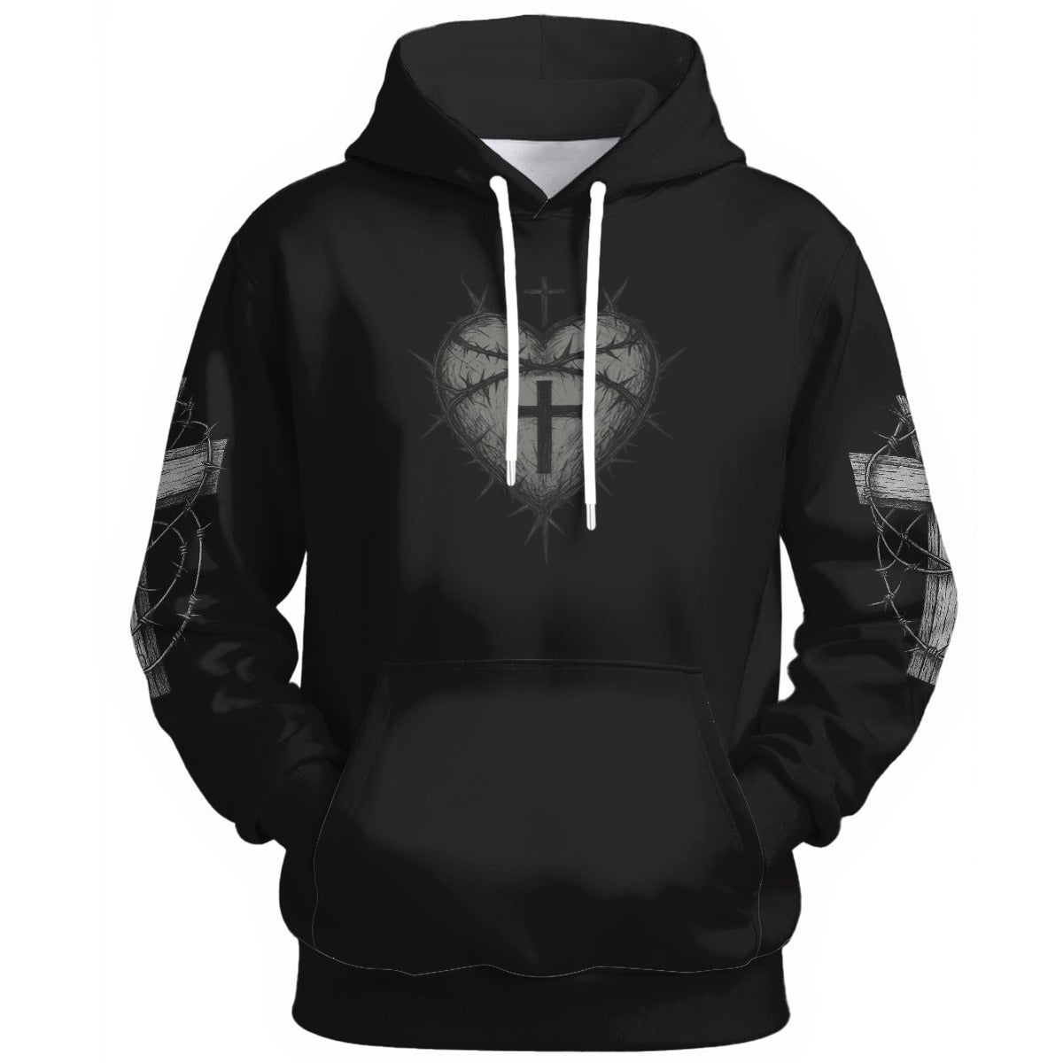 Camisola gótica preta com coração e cruz rodeados por coroa de espinhos