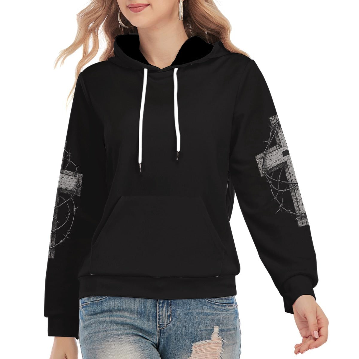 - Manga comprida, padrão de laço interior, com cordão, bolso canguru