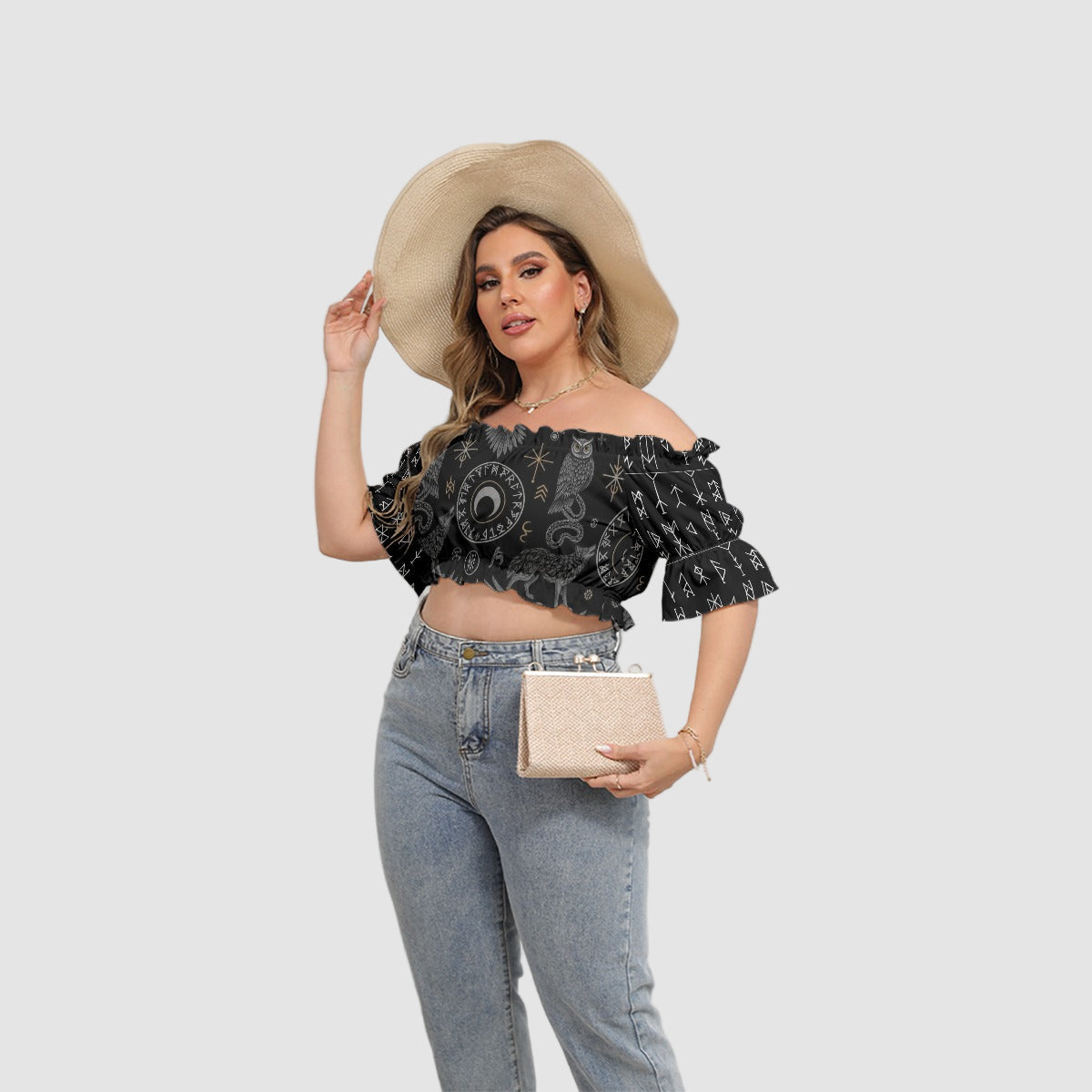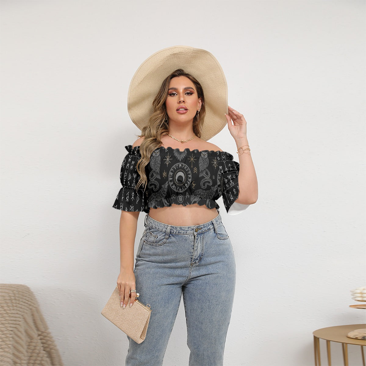 - Manga curta bufante, ombro descoberto, com laço
