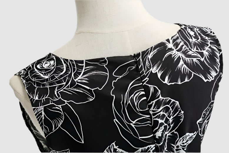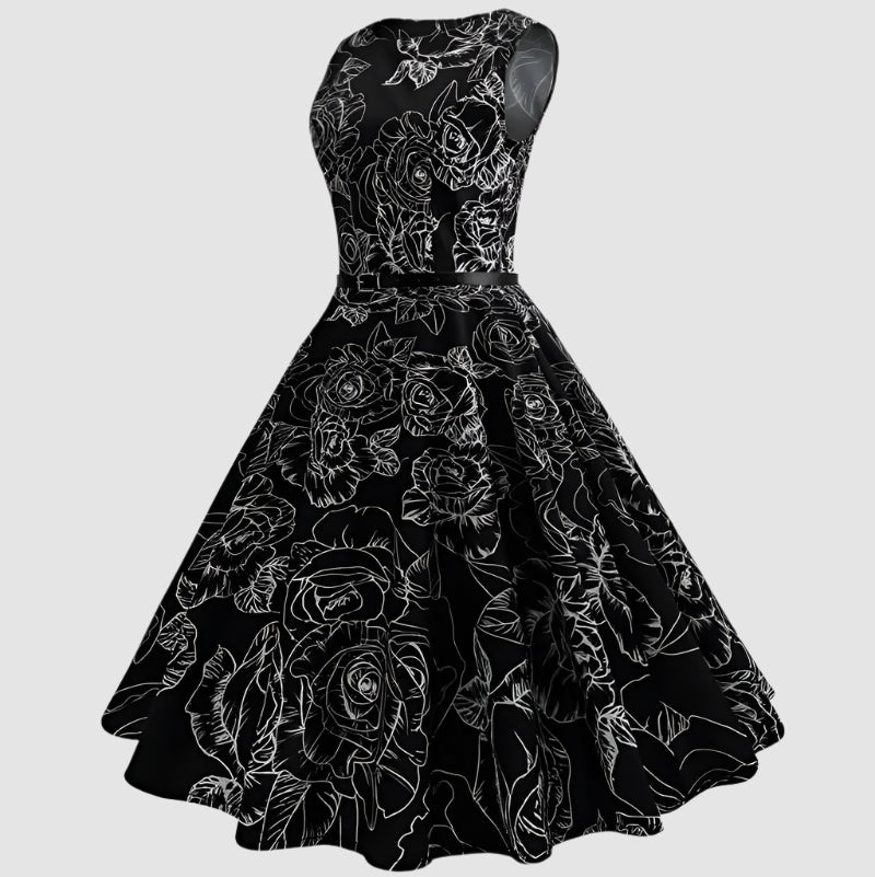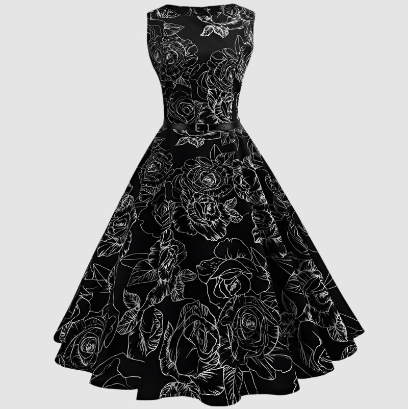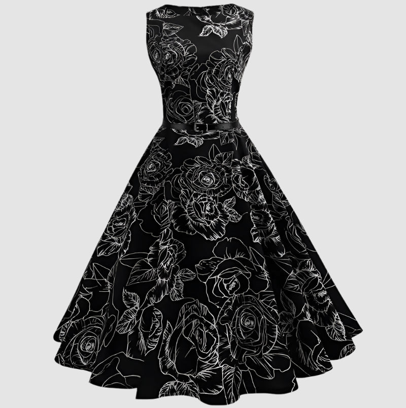 - Corte: vestido em formato A, comprimento até aos joelhos